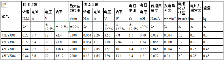 45LYX系列直流力矩電動(dòng)機(jī)性能參數(shù)表